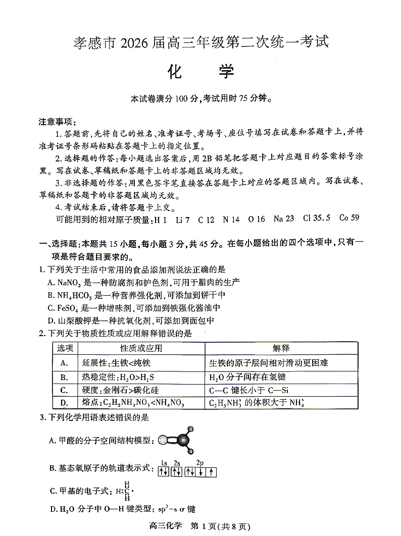 孝感市2026届高三年级第二次统一考试 化学.pdf
