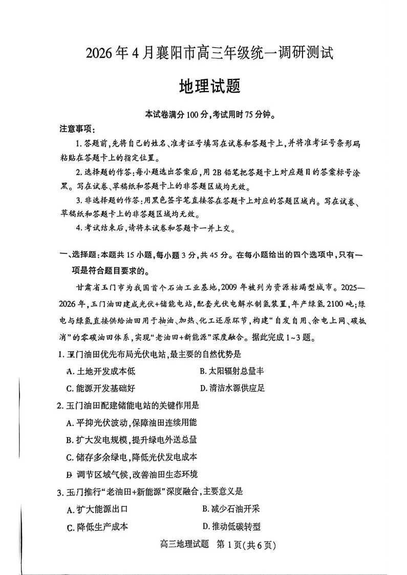 2026年4月襄阳市高三年级统一调研测试 地理.pdf
