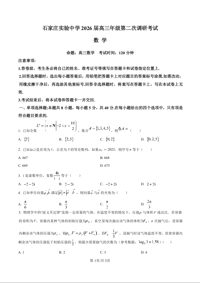 河北省石家庄实验中学2026届高三下学期第二次调研考试 数学.docx