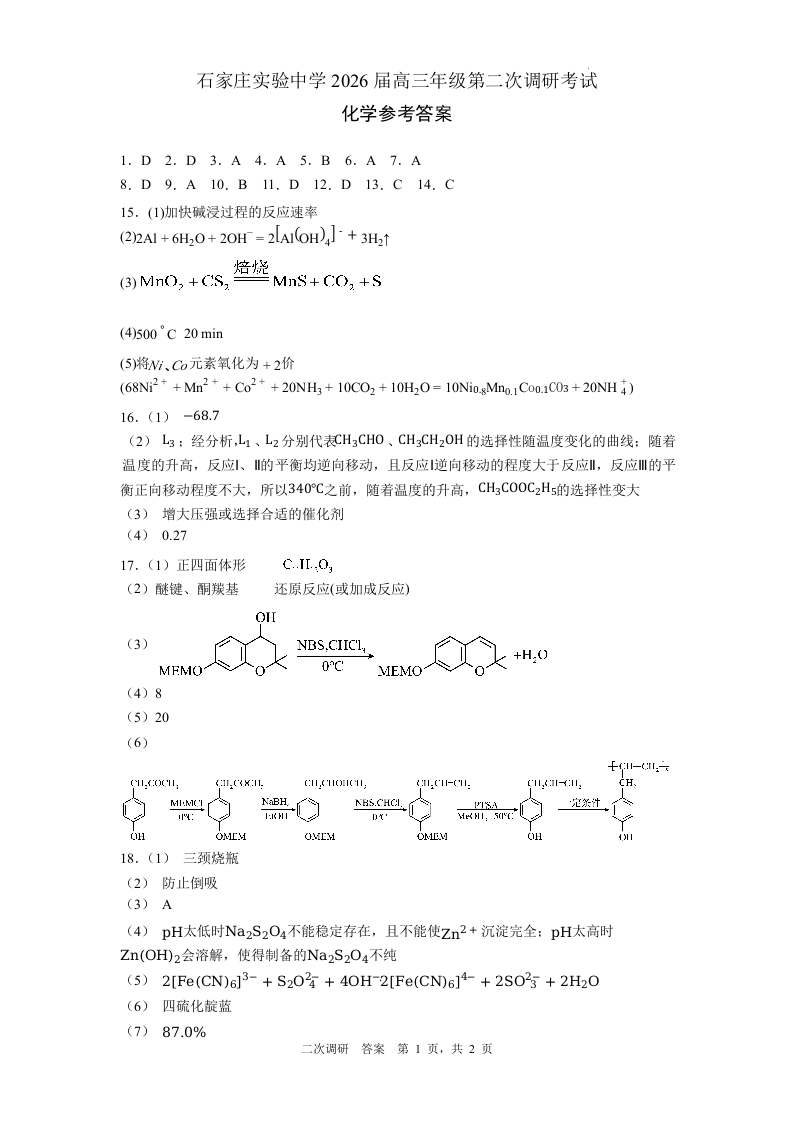 河北省石家庄实验中学2026届高三下学期第二次调研考试 化学答案.docx