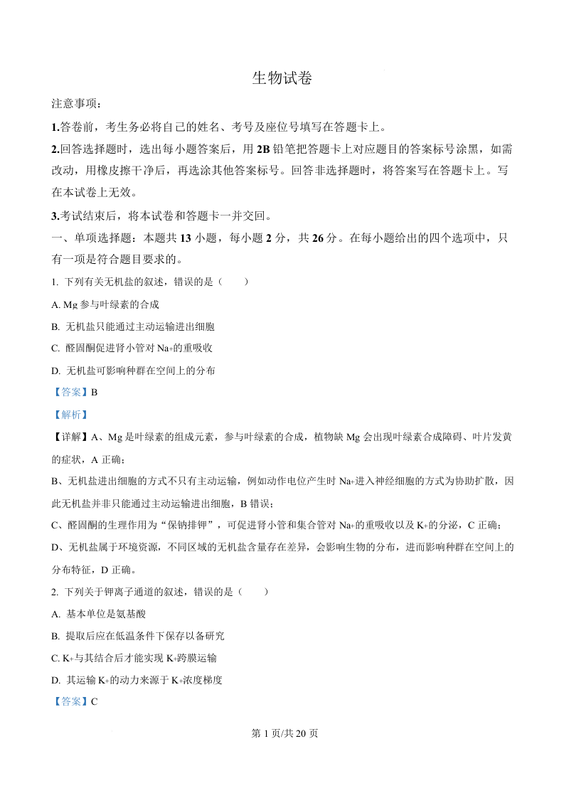 河北省沧州市2026届普通高中高三总复习质量监测 生物答案.docx