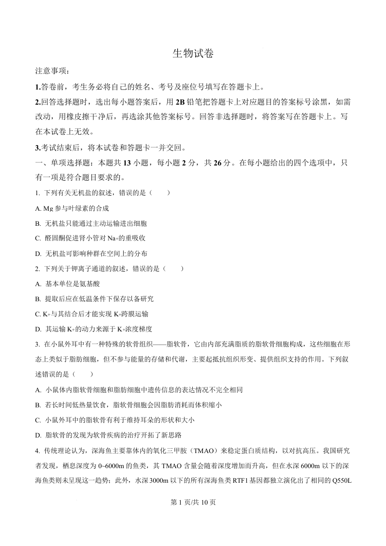 河北省沧州市2026届普通高中高三总复习质量监测 生物.docx