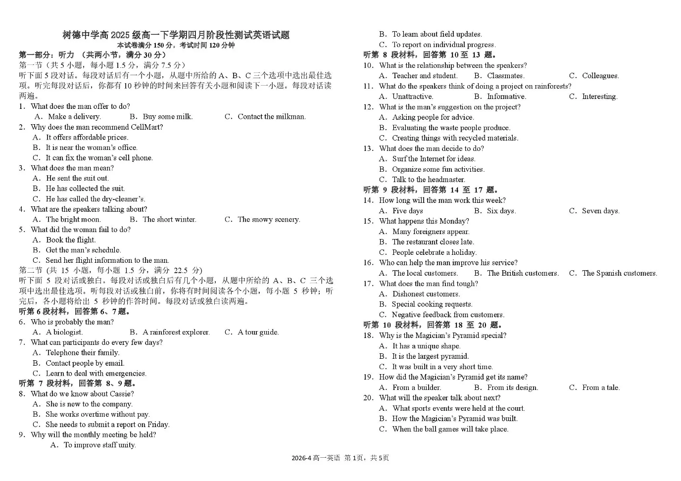 树德中学高2025级(2028届)高一年级下期4月阶段性测试 英语试题(含答案).pdf