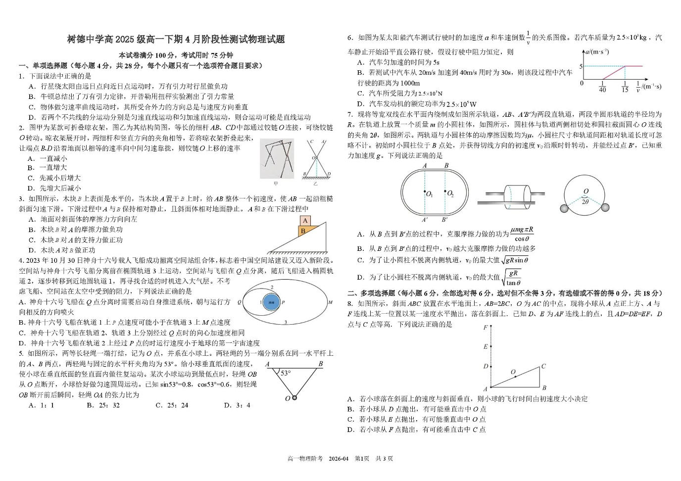 树德中学高2025级(2028届)高一年级下期4月阶段性测试 物理试题(含答案).pdf