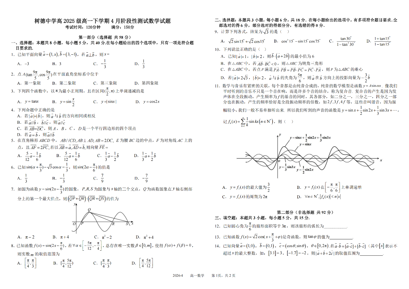 树德中学高2025级(2028届)高一年级下期4月阶段性测试 数学试题(含答案).pdf