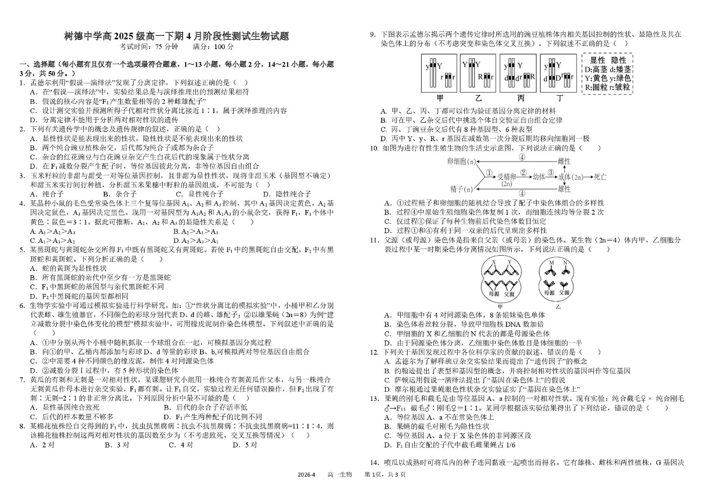 树德中学高2025级(2028届)高一年级下期4月阶段性测试 生物试题(含答案).pdf