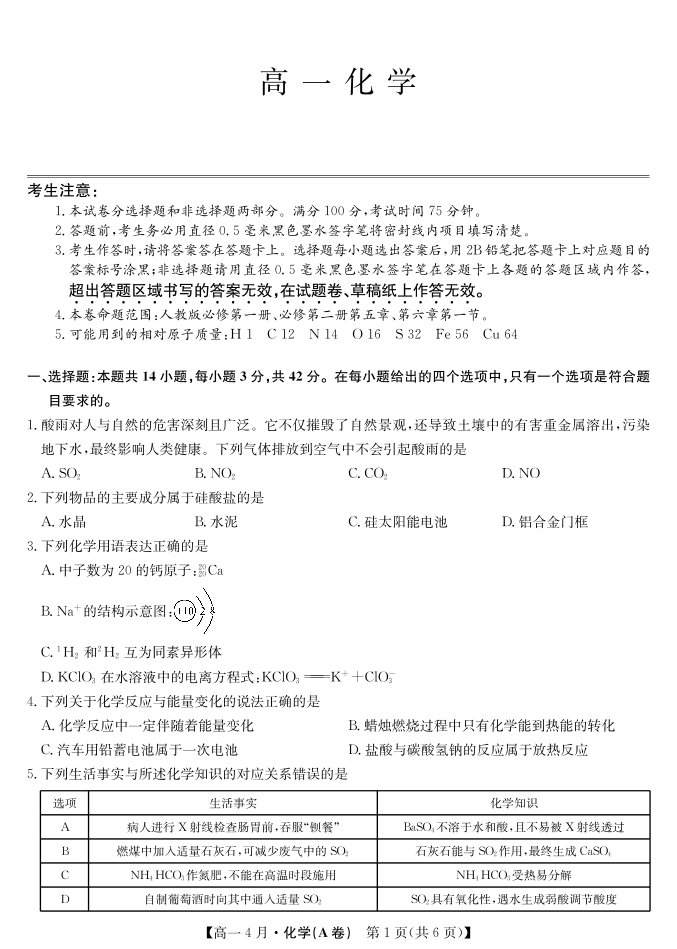安徽省太湖中学2028届高一下学期4月联考 化学.pdf