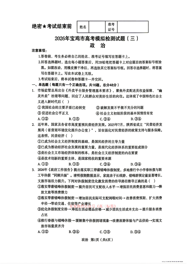2026年宝鸡市高考模拟检测试题(三)政治试题(含答案).pdf