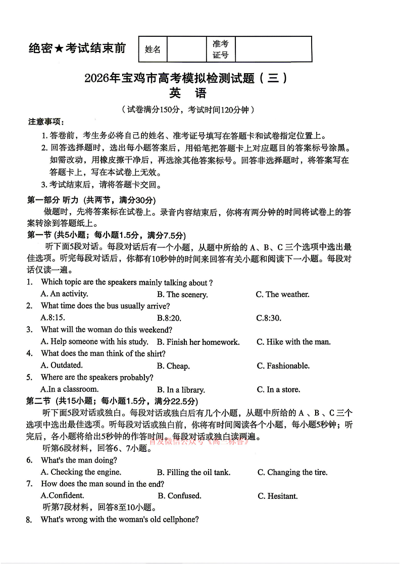2026年宝鸡市高考模拟检测试题(三)英语试题(含答案).pdf