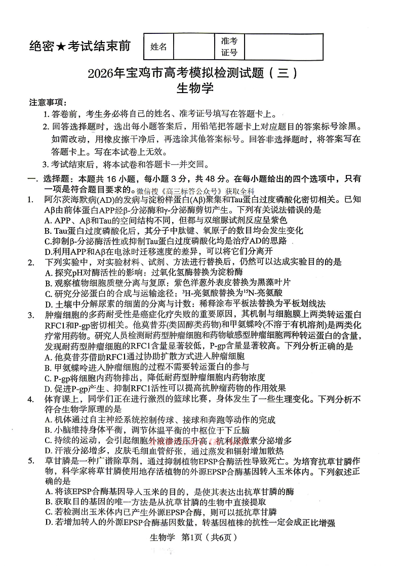 2026年宝鸡市高考模拟检测试题(三)生物试题(含答案).pdf