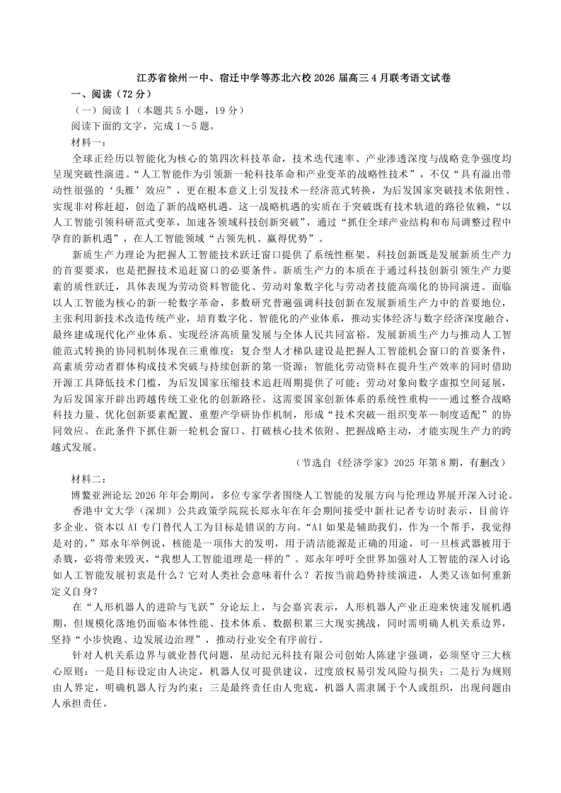 江苏省徐州市第一中学、宿迁中学等2026届高三4月六校联考 语文试卷(含答案).docx