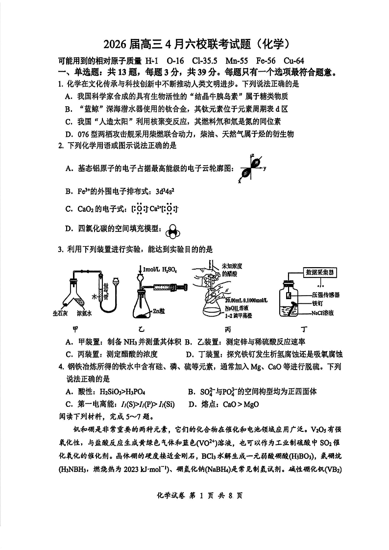 江苏省徐州市第一中学、宿迁中学等2026届高三4月六校联考 化学试卷(含答案).pdf