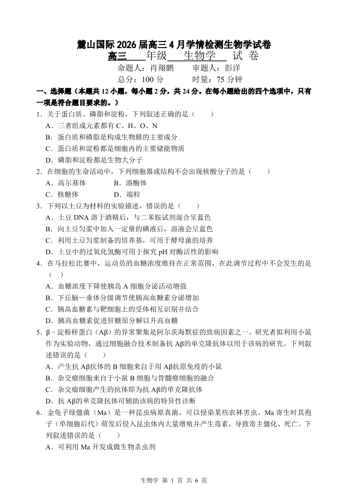 麓山国际2026届高三4月学情检测 生物.pdf