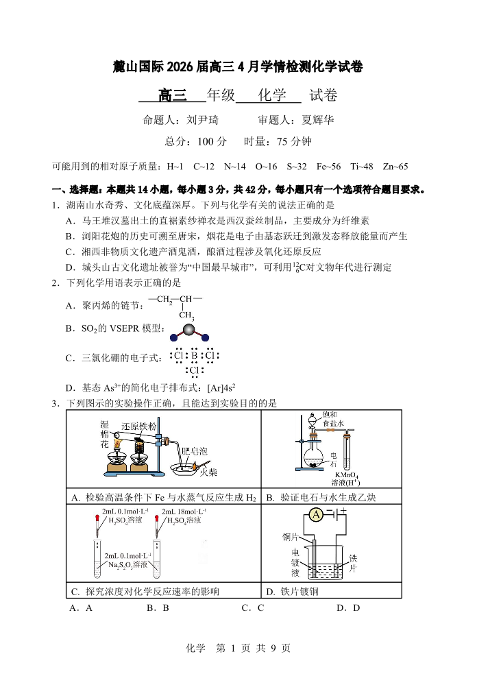 麓山国际2026届高三4月学情检测 化学.pdf