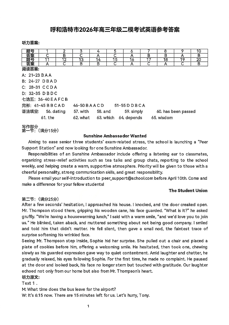 呼和浩特市2026年高三年级第二次模拟考试 英语答案.pdf