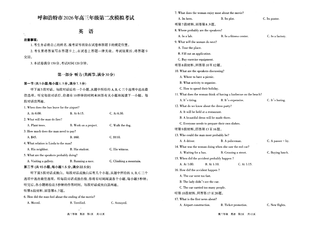 呼和浩特市2026年高三年级第二次模拟考试 英语.pdf