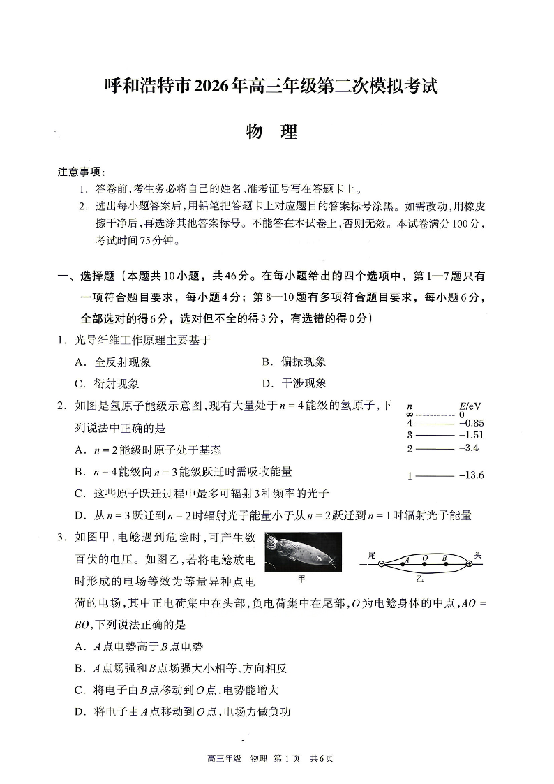 呼和浩特市2026年高三年级第二次模拟考试 物理.pdf
