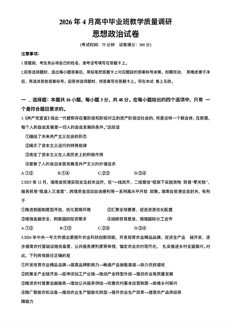 广西壮族自治区南宁市2026年4月高中毕业班教学质量调研 政治.pdf