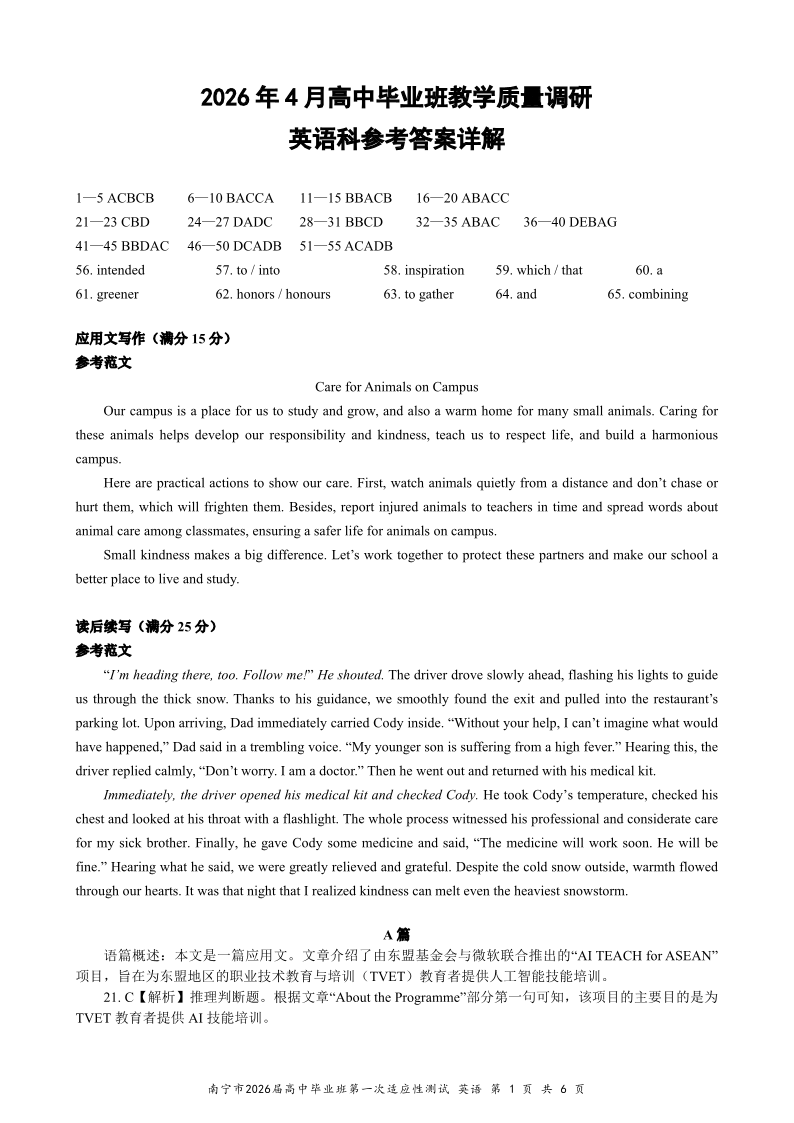广西壮族自治区南宁市2026年4月高中毕业班教学质量调研 英语答案.pdf