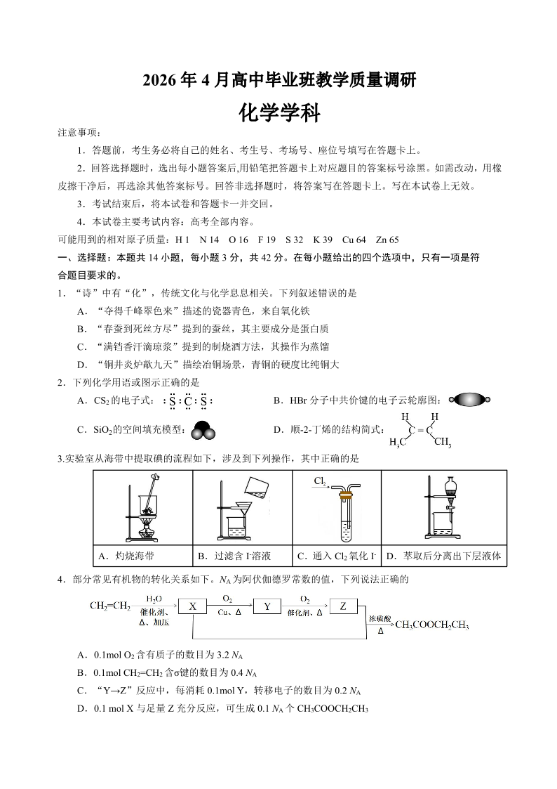 广西壮族自治区南宁市2026年4月高中毕业班教学质量调研 化学.pdf