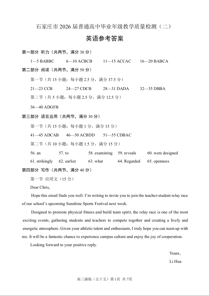 石家庄市2026届普通高中毕业年级高三年级教学质量检测(二)英语答案.docx