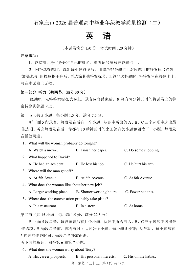 石家庄市2026届普通高中毕业年级高三年级教学质量检测(二)英语.docx