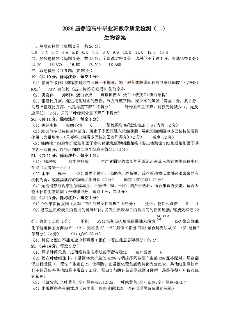 石家庄市2026届普通高中毕业年级高三年级教学质量检测(二)生物答案.pdf