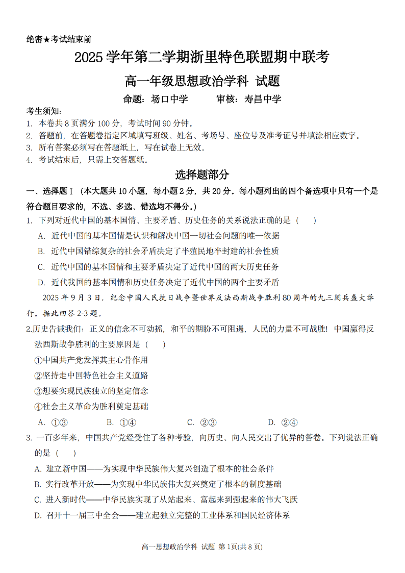 浙里特色联盟2025学年高一第二学期期中联考 政治.pdf