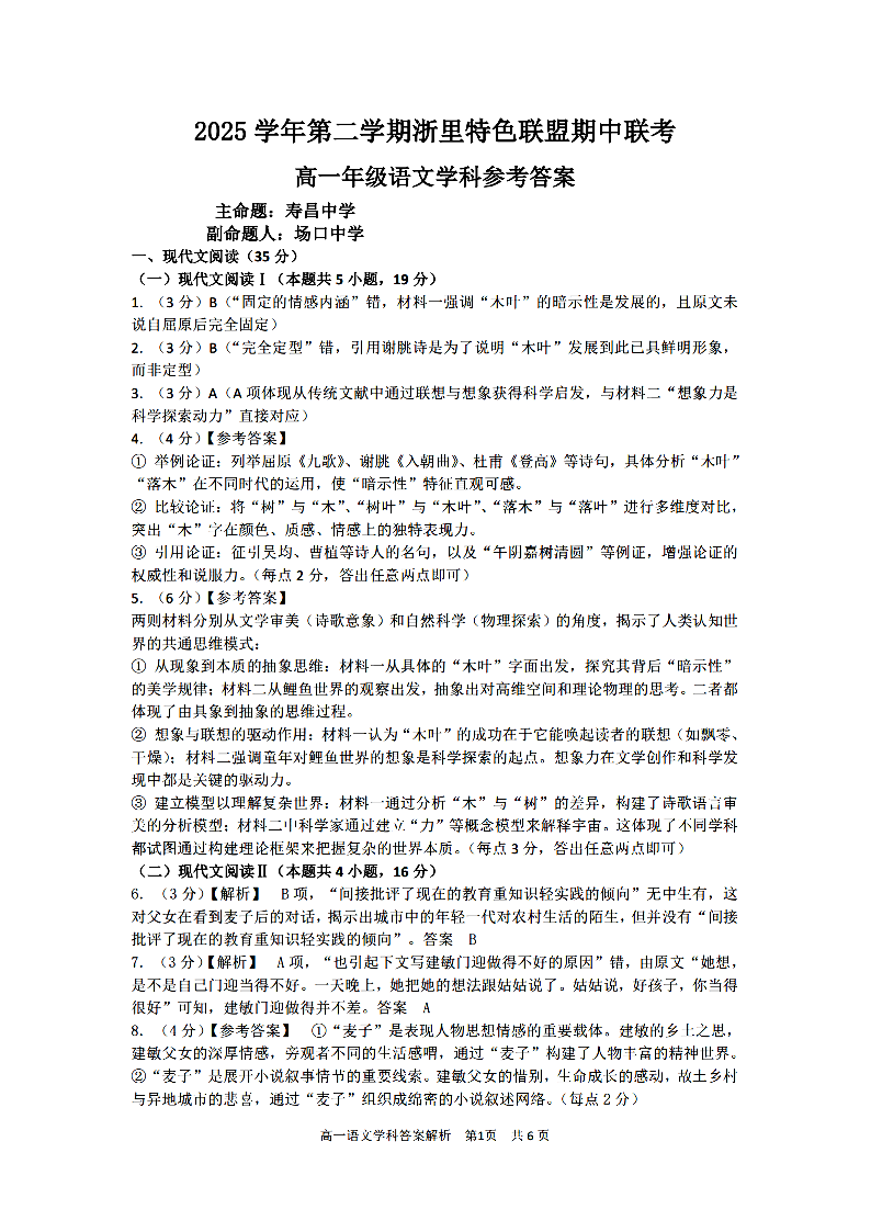 浙里特色联盟2025学年高一第二学期期中联考 语文答案.pdf