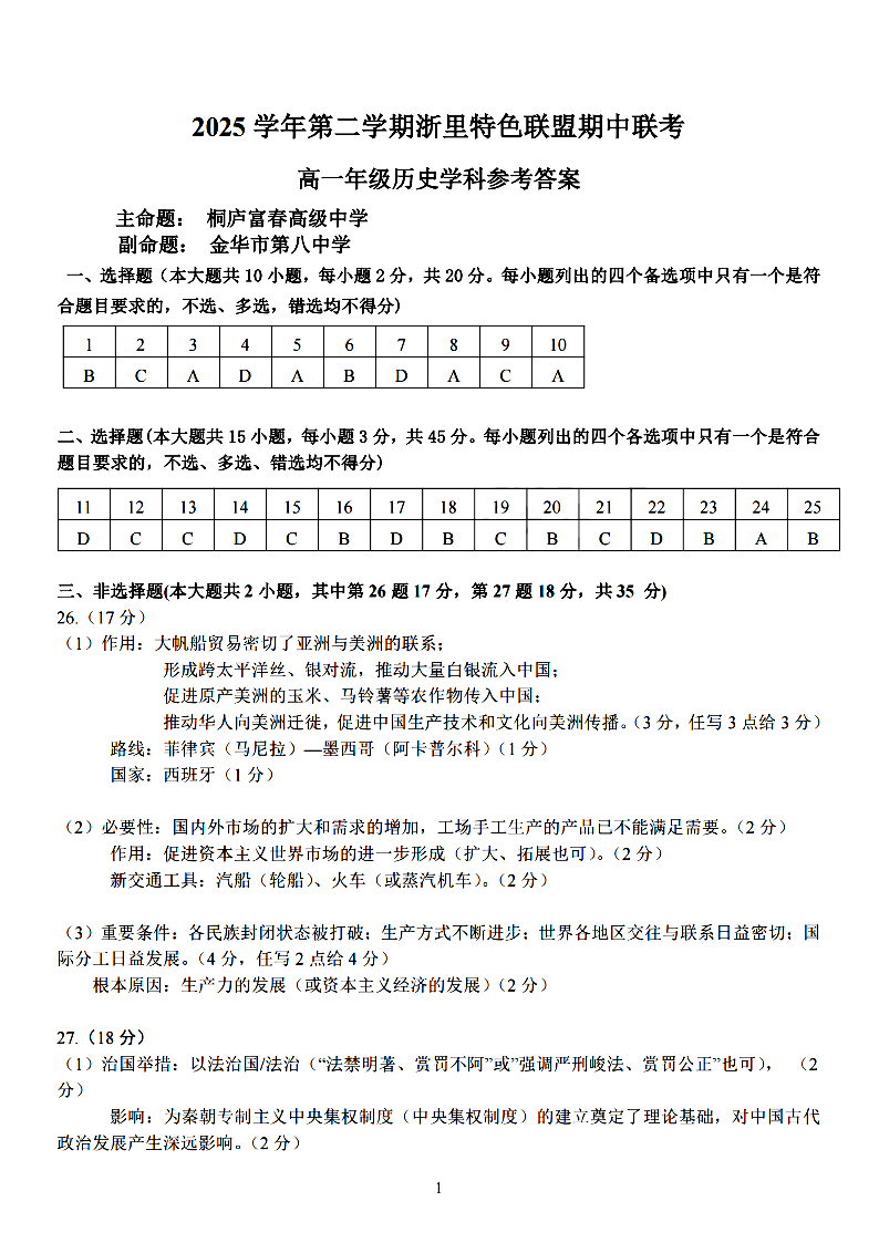 浙里特色联盟2025学年高一第二学期期中联考 历史答案.pdf