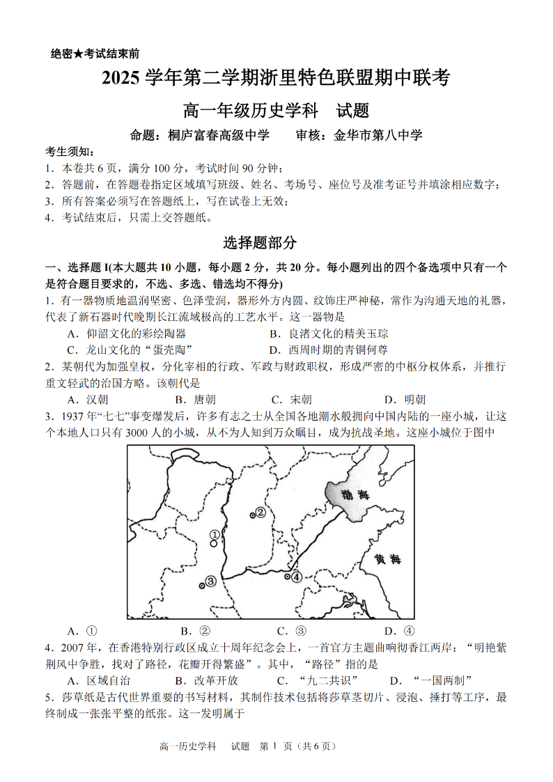 浙里特色联盟2025学年高一第二学期期中联考 历史.pdf