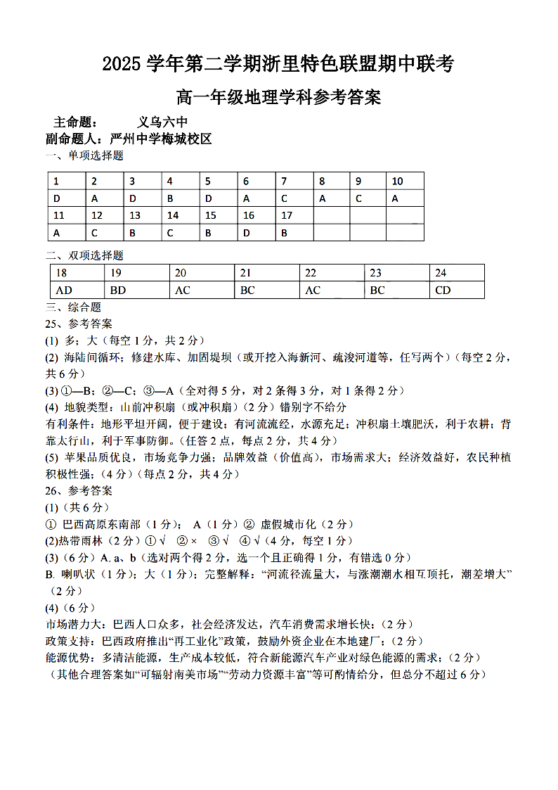 浙里特色联盟2025学年高一第二学期期中联考 地理答案.pdf