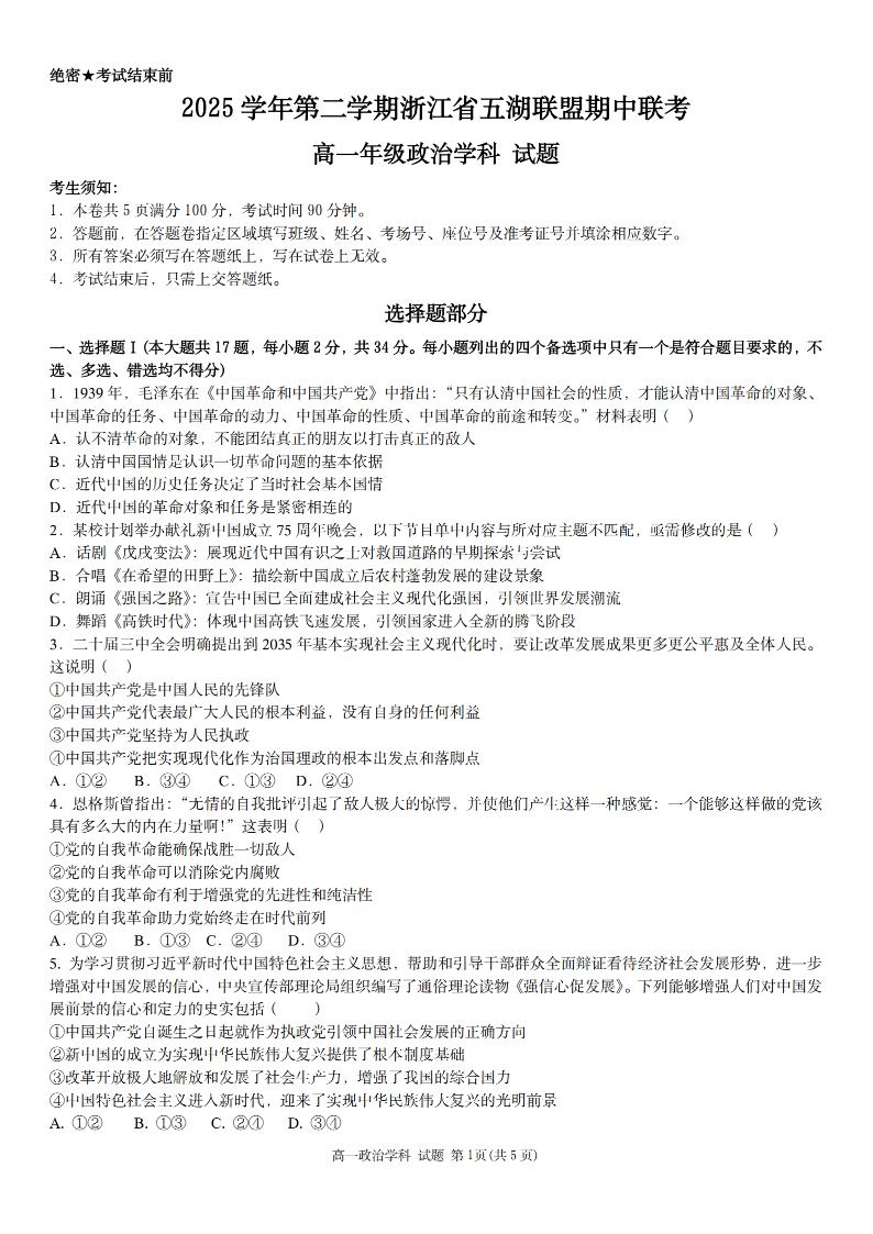 浙江省五湖联盟2025学年高一第二学期期中联考 政治.pdf
