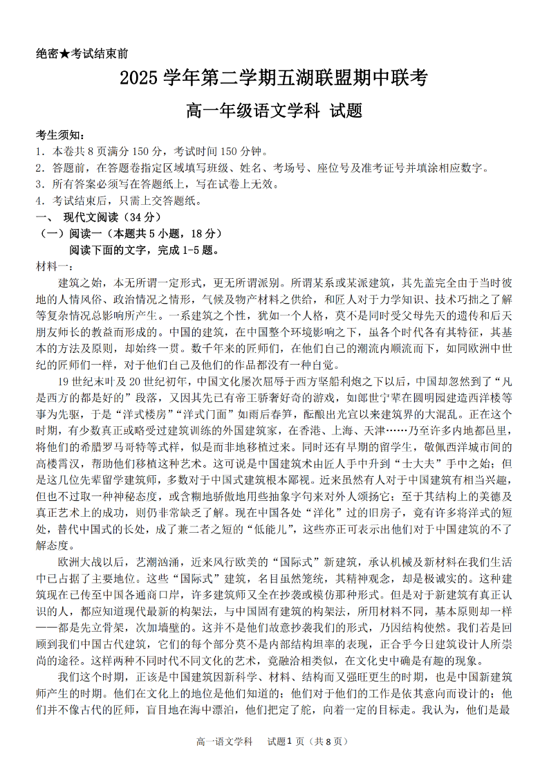 浙江省五湖联盟2025学年高一第二学期期中联考 语文.pdf