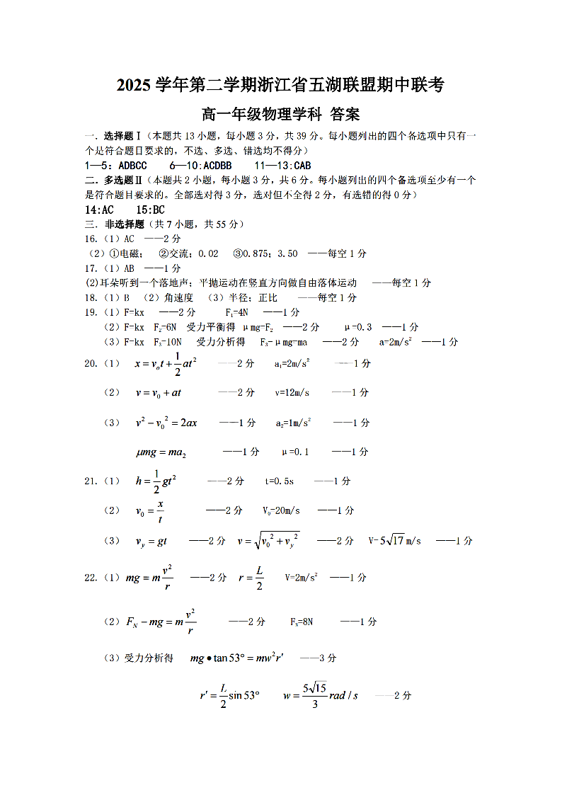 浙江省五湖联盟2025学年高一第二学期期中联考 物理答案.pdf