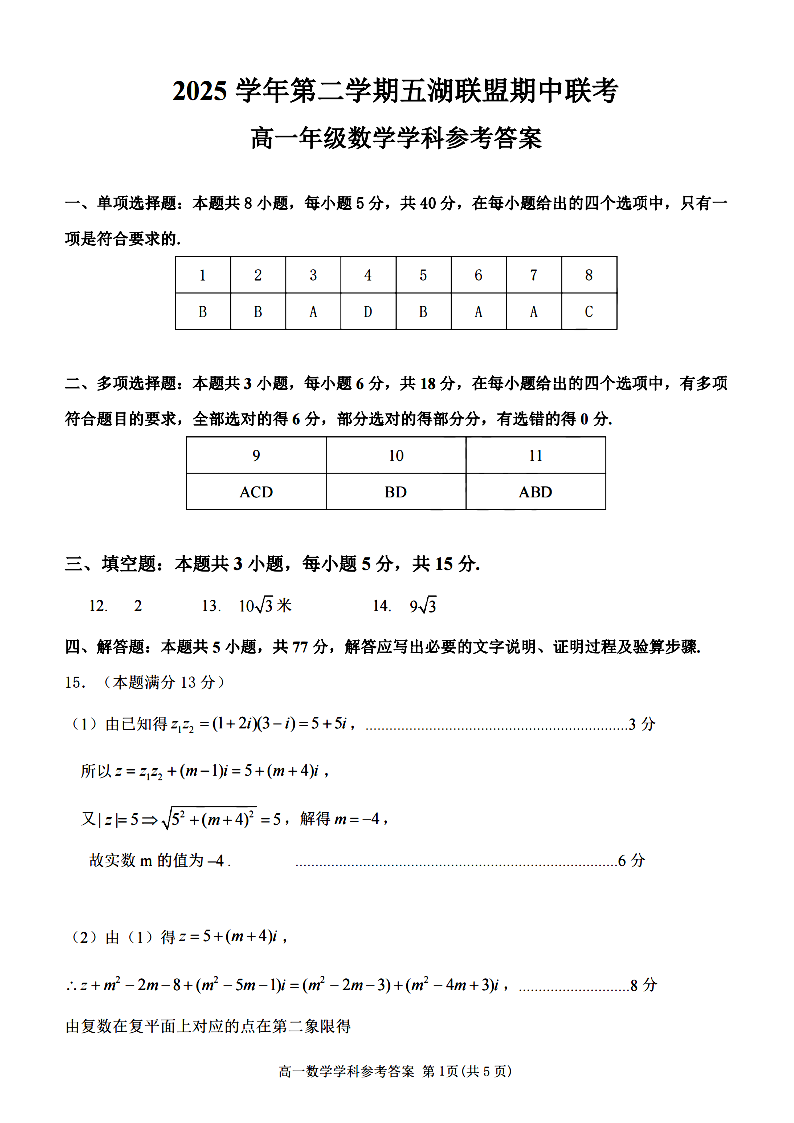 浙江省五湖联盟2025学年高一第二学期期中联考 数学答案.pdf