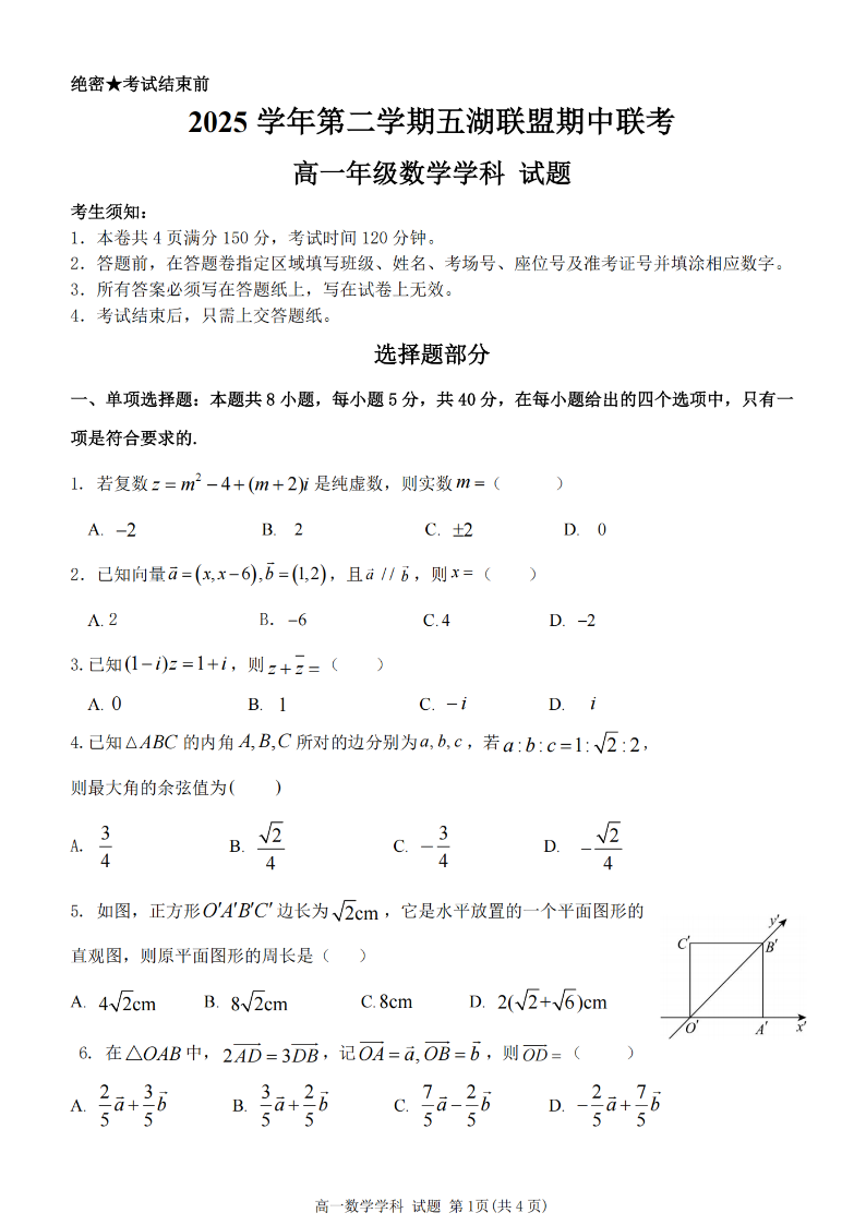 浙江省五湖联盟2025学年高一第二学期期中联考 数学.pdf