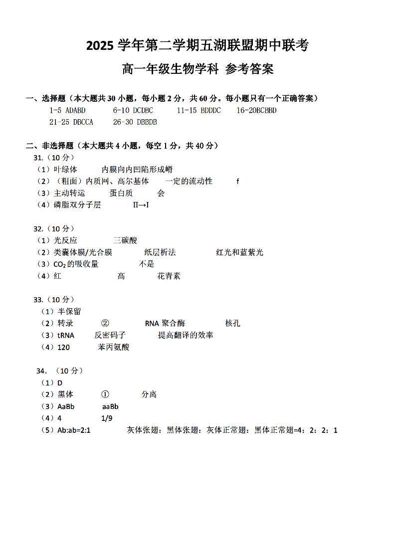 浙江省五湖联盟2025学年高一第二学期期中联考 生物答案.pdf
