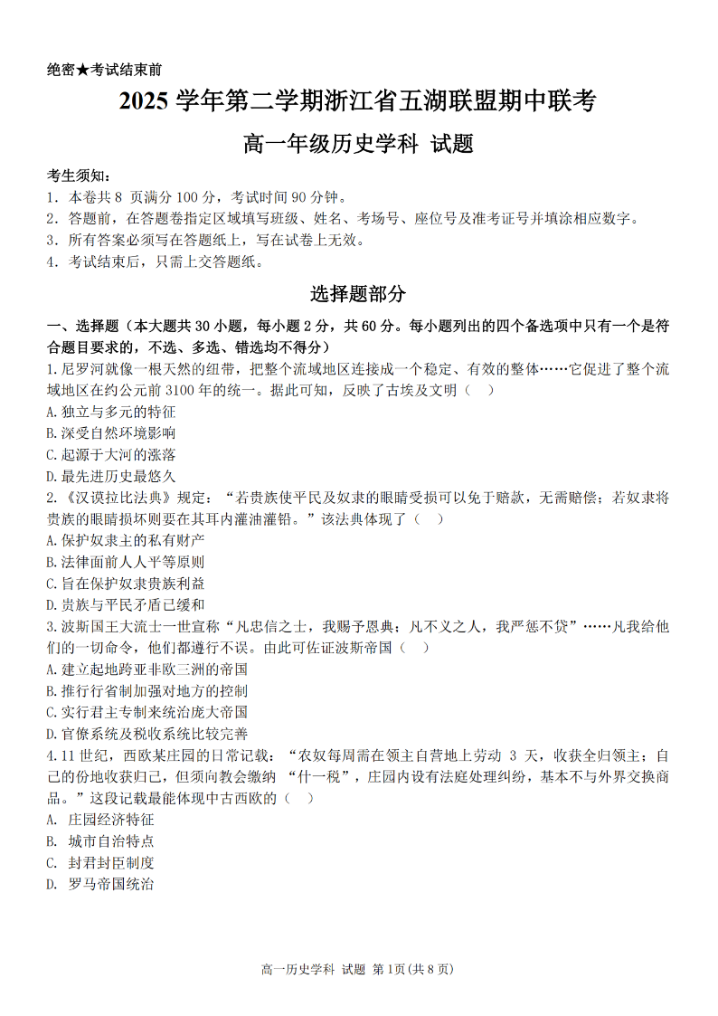 浙江省五湖联盟2025学年高一第二学期期中联考 历史.pdf