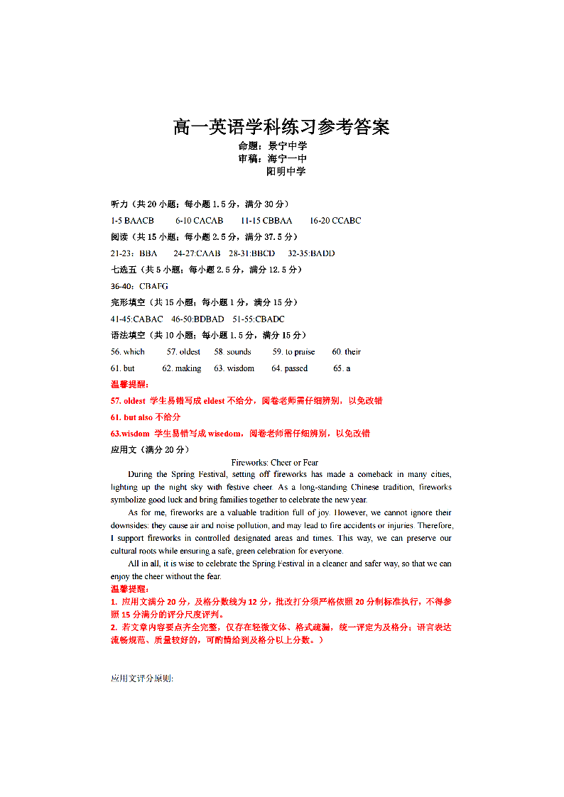 七彩阳光新高考研究联盟2025学年高一第二学期期中联考 英语答案.pdf