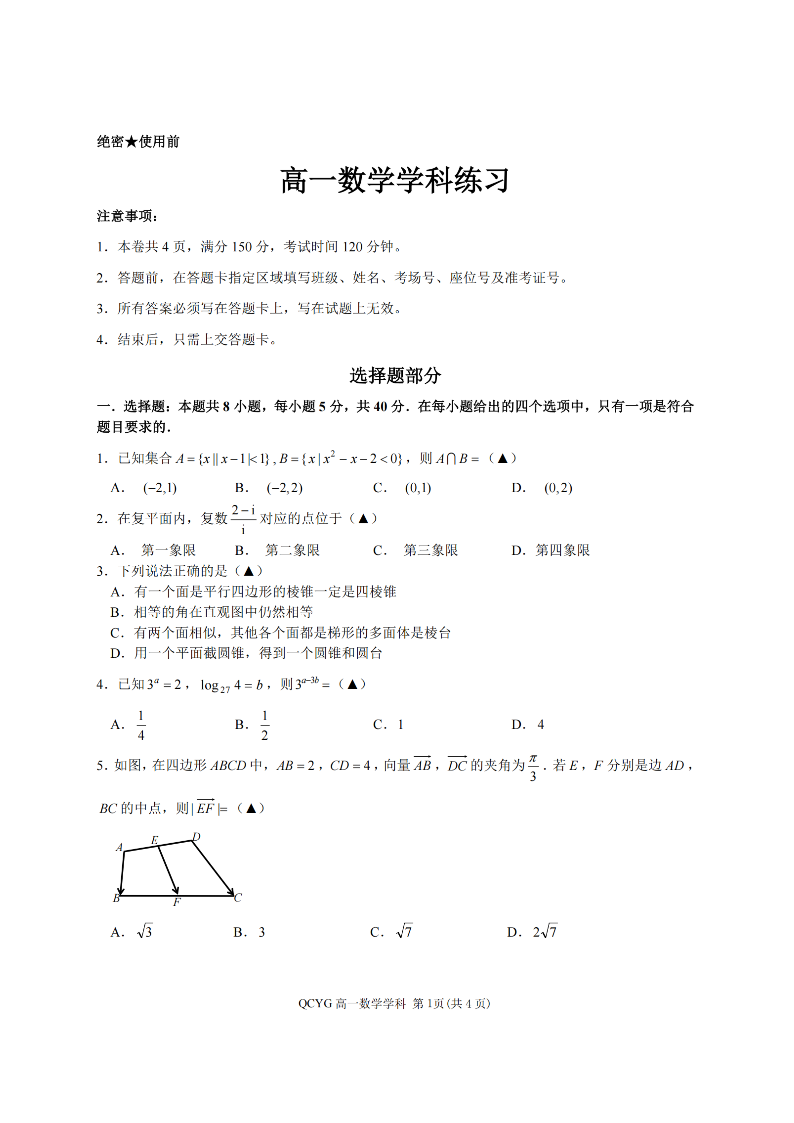 七彩阳光新高考研究联盟2025学年高一第二学期期中联考 数学.pdf