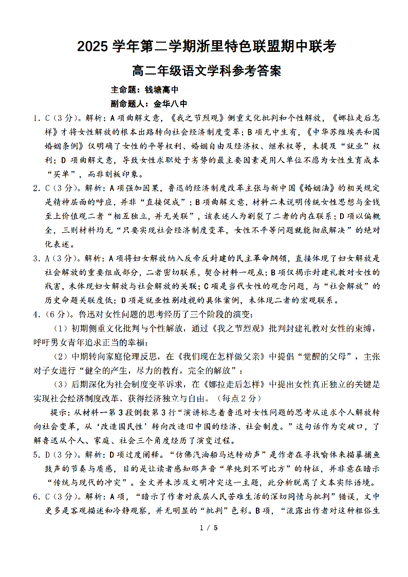 浙里特色联盟2025学年高二第二学期期中联考 语文答案.pdf