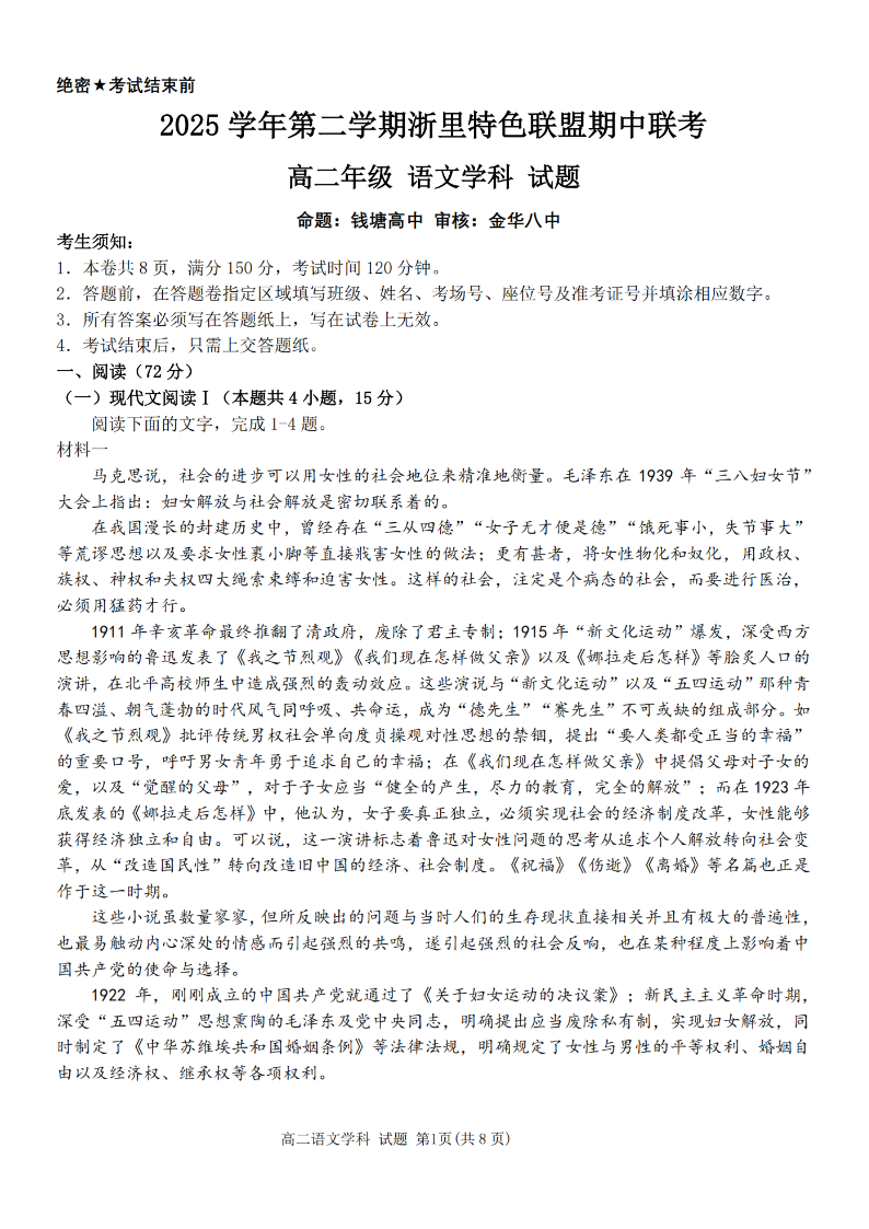 浙里特色联盟2025学年高二第二学期期中联考 语文.pdf