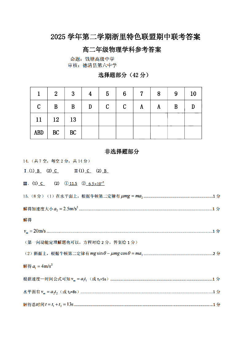 浙里特色联盟2025学年高二第二学期期中联考 物理答案.pdf