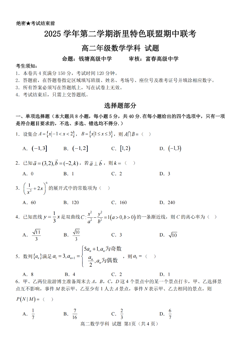 浙里特色联盟2025学年高二第二学期期中联考 数学.pdf