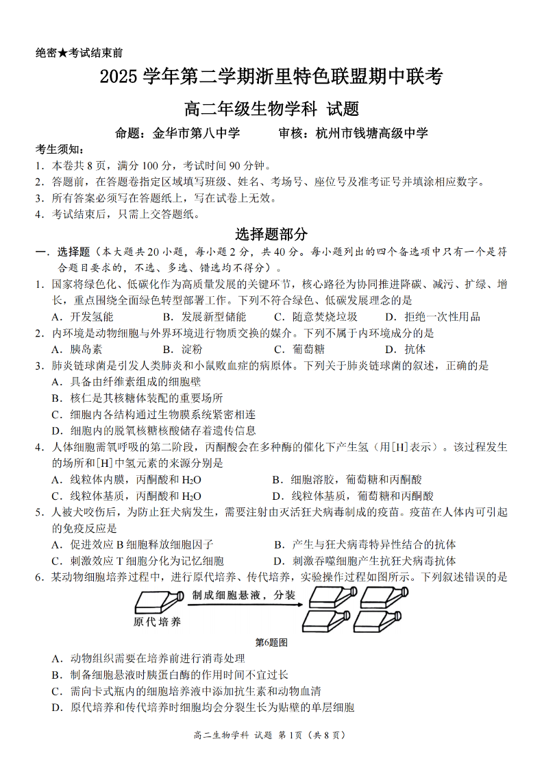 浙里特色联盟2025学年高二第二学期期中联考 生物.pdf