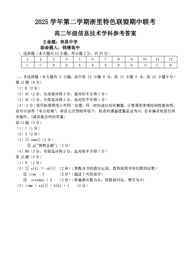 浙里特色联盟2025学年高二第二学期期中联考 技术答案.pdf