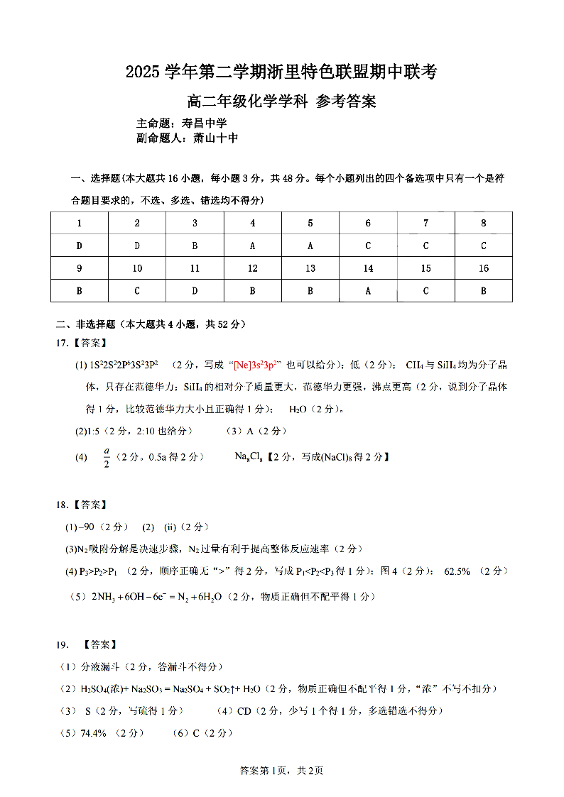 浙里特色联盟2025学年高二第二学期期中联考 化学答案.pdf