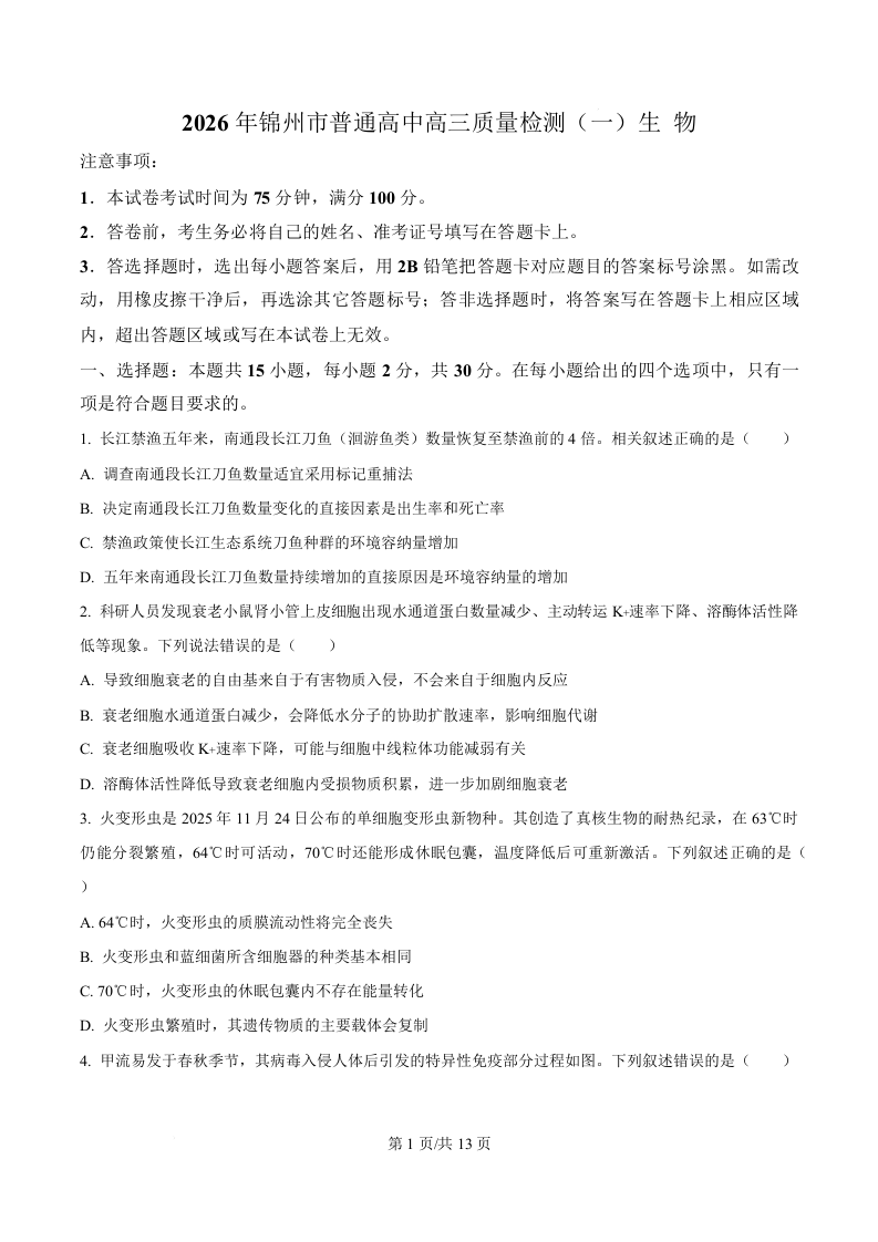 辽宁省锦州市2026届高三下学期质量检测(一)生物.docx