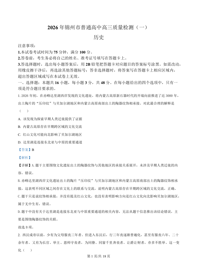 辽宁省锦州市2026届高三下学期质量检测(一)历史答案.docx